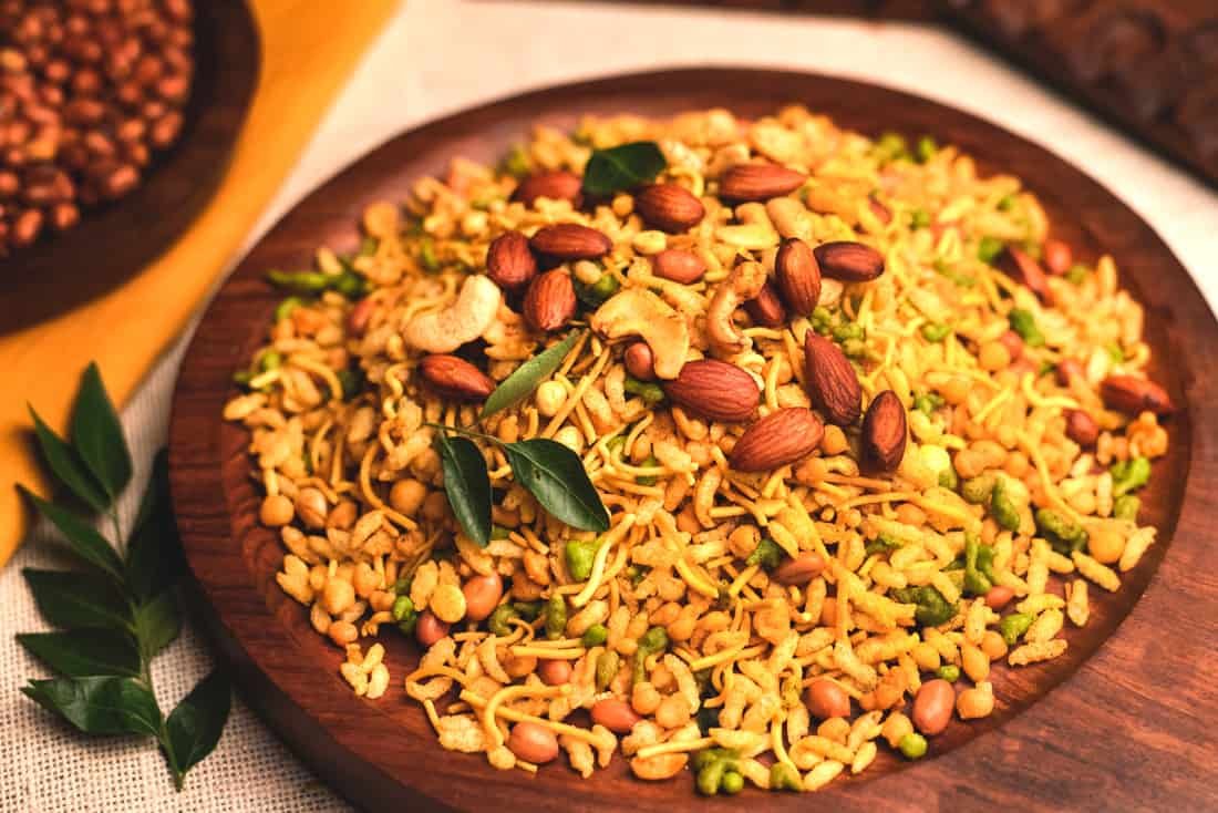 A delicious and crunchy blend of raisins, almonds, cashews, sev, peanuts, fried chana dal, and crispy beaten rice, seasoned with aromatic curry leaves, salt, and black pepper. This savory snack is a perfect mix of taste and nutrition, ideal for any time munching!